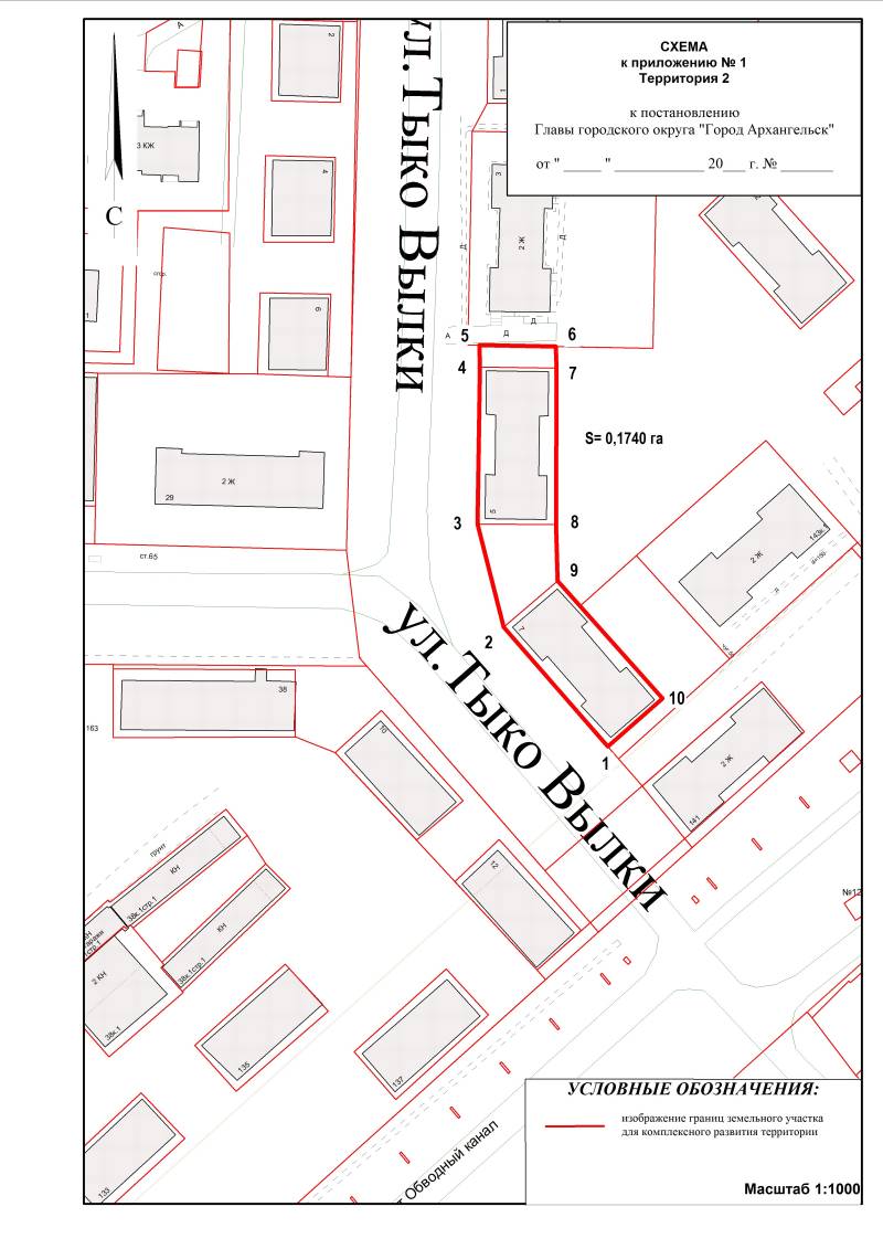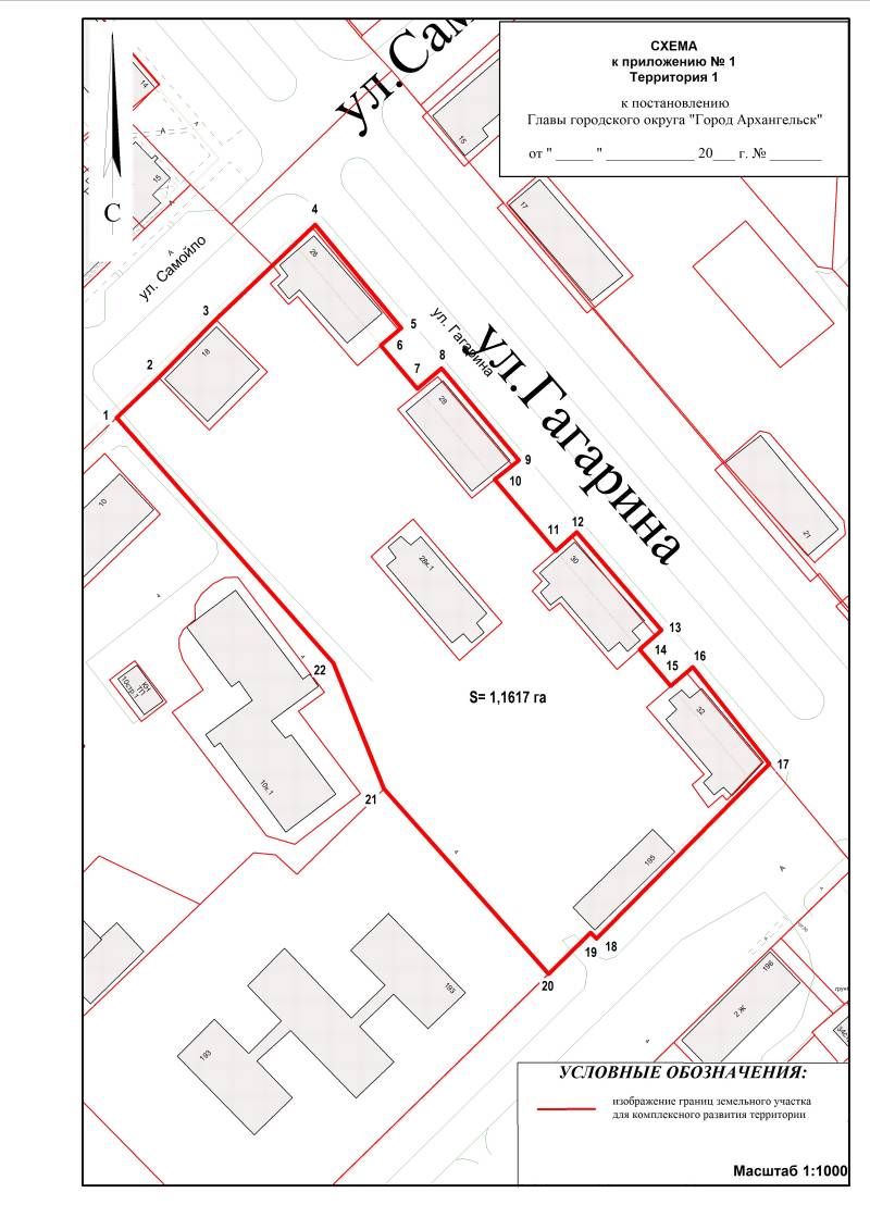 Комплексное развитие территории жилой застройки городского округа "Город Архангельск" в отношении двух несмежных территорий, в границах которых предусматривается осуществление деятельности по комплексному развитию территории, с заключением одного договора о комплексном развитии таких территорий: в границах части элемента планировочной структуры: ул. Гагарина, просп. Советских космонавтов, ул. Самойло, площадью 1,1617 га (Территория 1); в границах части элемента планировочной структуры: проезда Сибиряковцев, просп. Обводный канал, ул. Теснанова, площадью 0,1740 га (Территория 2).