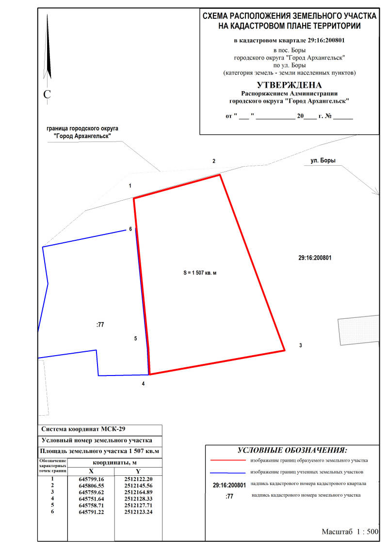 Департамент градостроительства Администрации городского округа "Город Архангельск" извещает о возможности предоставления земельного участка, расположенного в поселке Боры городского округа "Город Архангельск" по ул. Боры в кадастровом квартале 29:16:200801 площадью 1507 кв. м, для индивидуального жилищного строительства согласно представленной схеме расположения земельного участка.