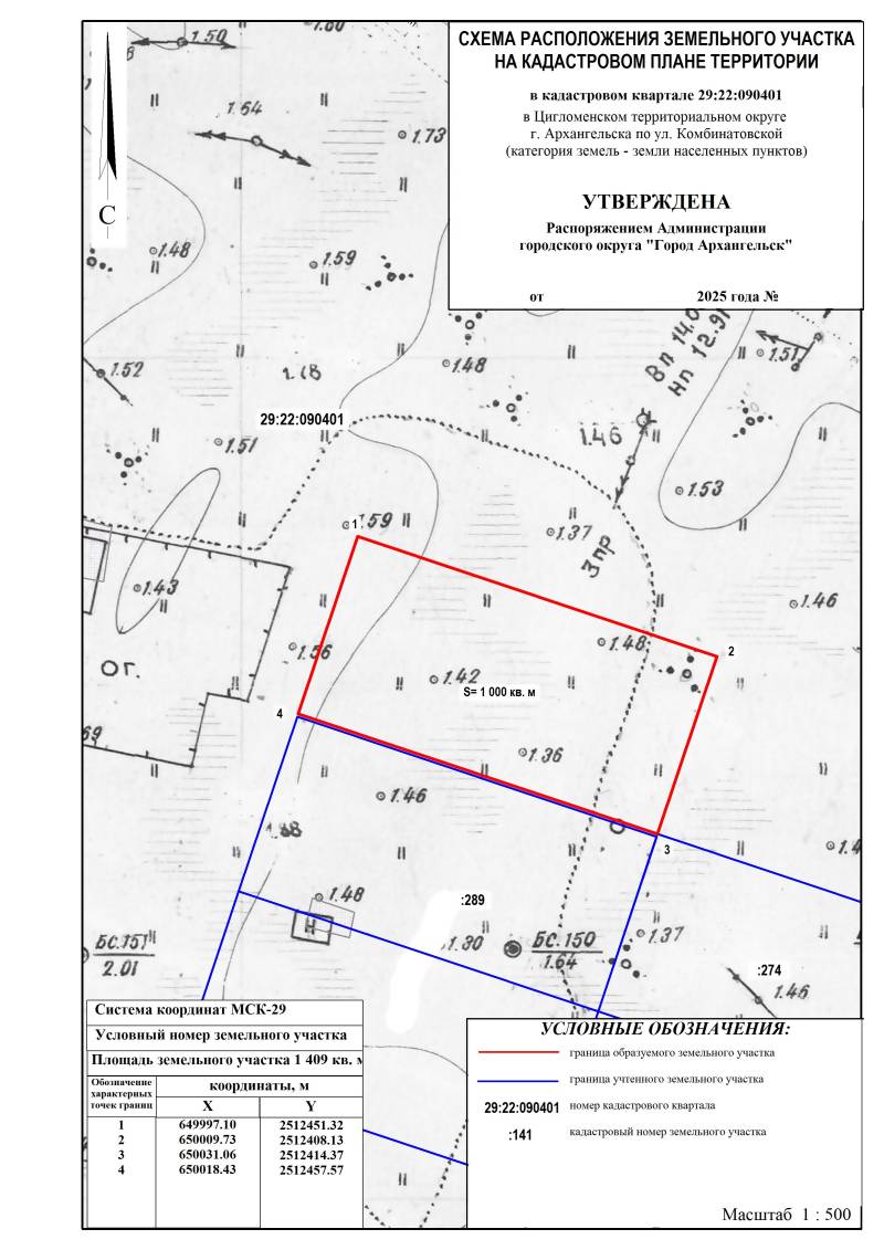 Извещение о предоставлении земельного участка для индивидуального жилищного строительства, расположенного в Цигломенском территориальном округе г. Архангельска по ул. Комбинатовской площадью 1 000 кв. м