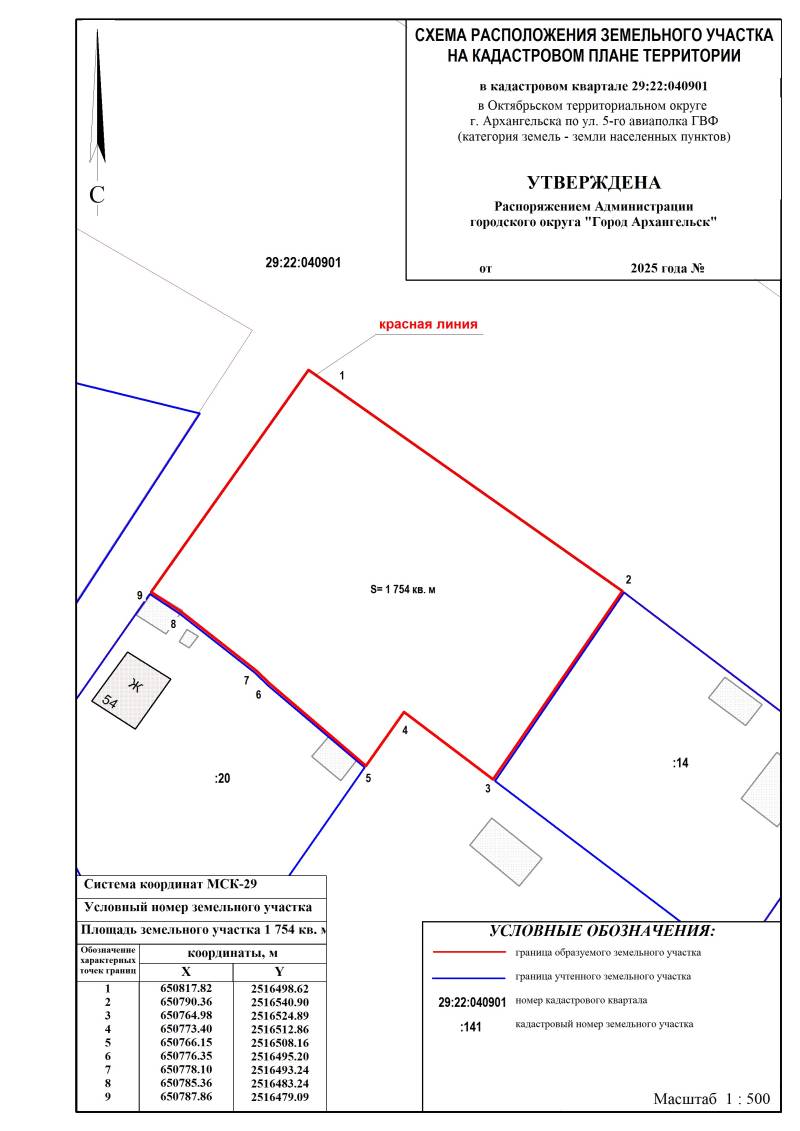 Департамент градостроительства Администрации городского округа "Город Архангельск" извещает о возможности предоставления земельного участка, расположенного в Октябрьском территориальном округе г. Архангельска по ул. 5-го авиаполка ГВФ площадью 1 754 кв. м, для индивидуального жилищного строительства согласно представленной схеме расположения земельного участка.
