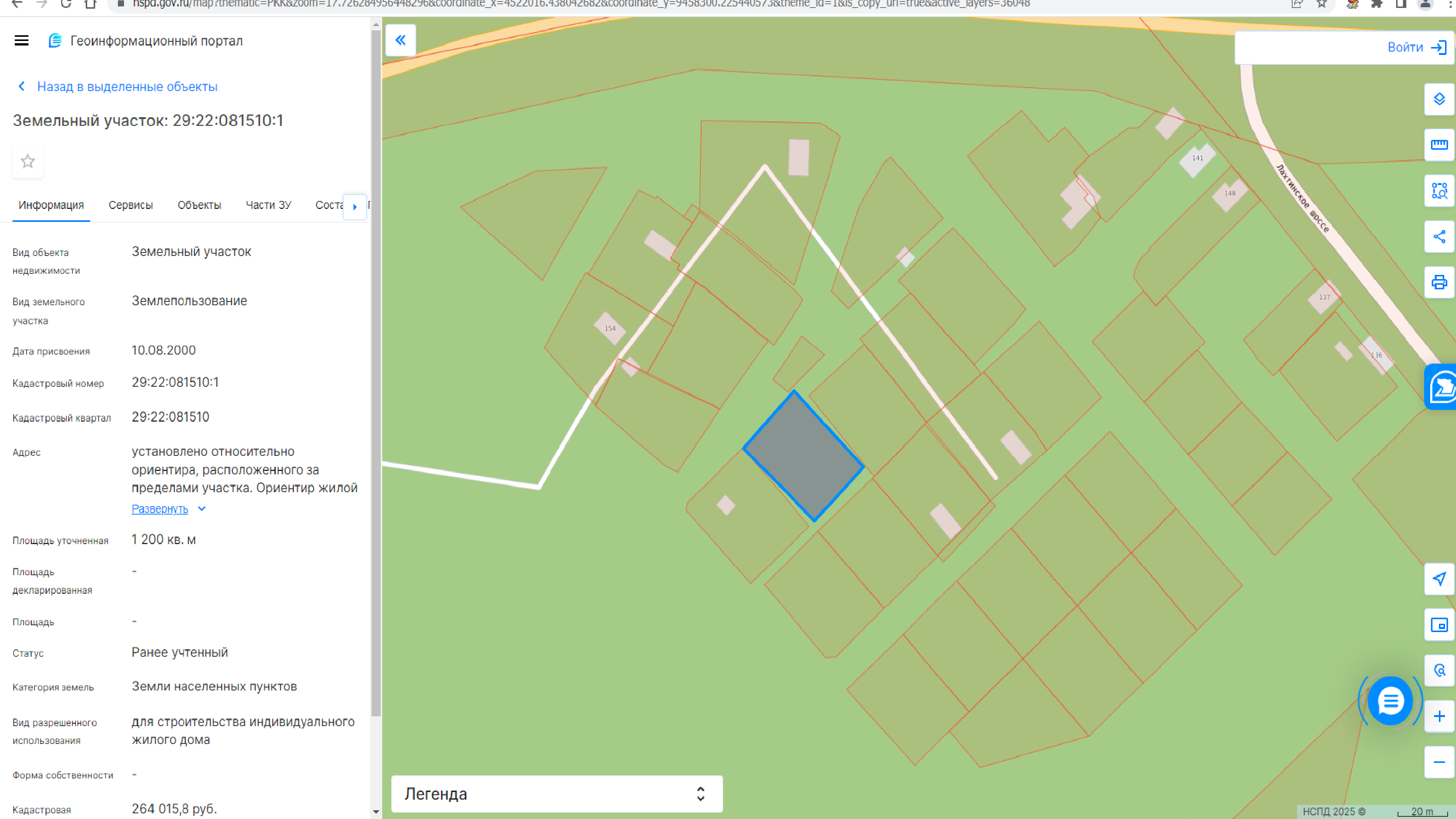 Извещение о предоставлении земельного участка для индивидуального жилищного строительства, с кадастровым номером 29:22:081510:1, расположенного в посёлке Лесная речка городского округа "Город Архангельск" по Лахтинскому шоссе площадью 1 200 кв. м